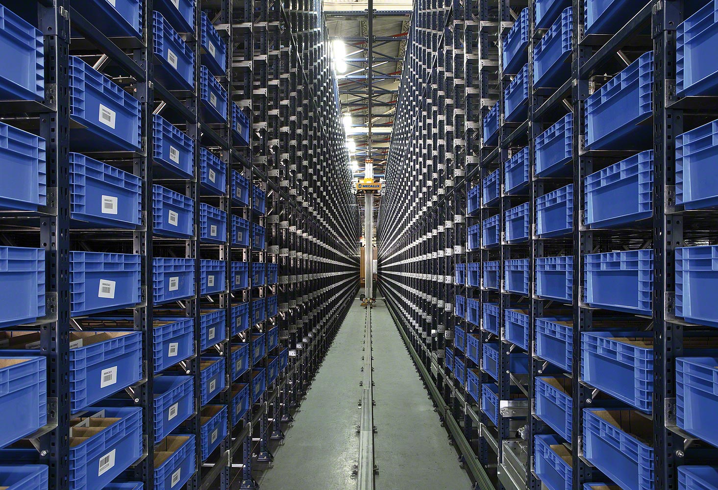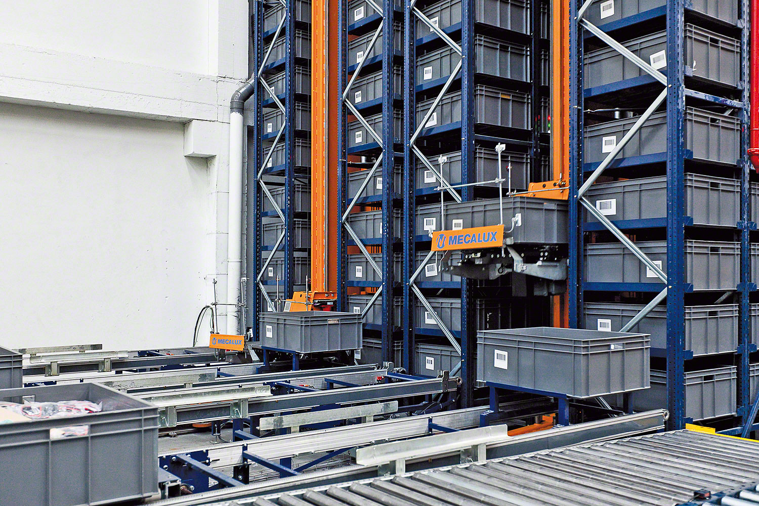 Automated warehouse storage system for boxes or trays that integrates shelving, machinery and warehouse management software all in one. It is made up of a central aisle, along which a stacker crane travels, and two racks built at either side used to store boxes or trays. The picking and handling area is formed by conveyors and is positioned at one end or at the side of the racking. Here, the stacker crane deposits the load extracted from the rack. The conveyors then take the box to the operator and once he/she has finished the job, it is returned to the stacker crane which then places it back in the racking. The whole system is controlled by a management software package which registers the location of all the materials in the warehouse and keeps a real time inventory.