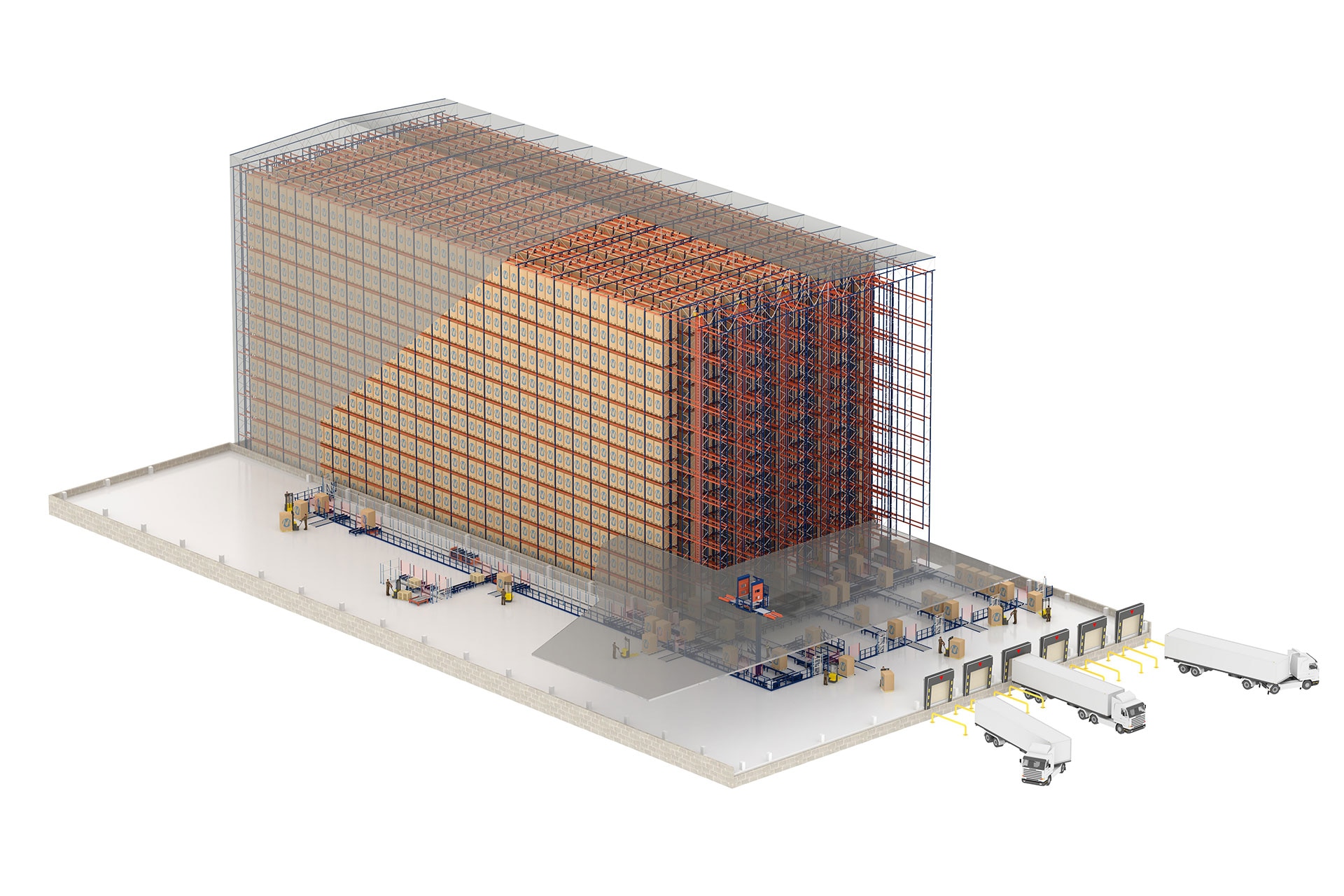 The warehouse, formed by five aisles with double-deep racking on both sides, will fulfil two functions. On the one hand, it will automatically supply the production lines with the parts and semi-finished goods used in manufacturing via a conveyor circuit. On the other hand, it will receive the finished merchandise from the production centre to store it prior to its distribution to customers.